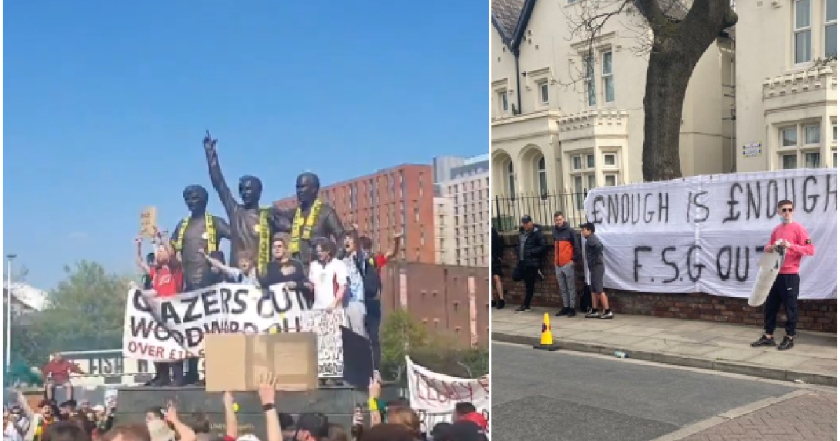 Οι οπαδοί των δύο γιγάντων του Νησιού έστησαν το δικό τους πεδίο διαμαρτυρίας, με αυτούς των Κόκκινων Διαβόλων να διαδηλώνουν μαζικά έξω από το «Ολντ Τράφορντ», λίγες μέρες από το «ντου» που πραγματοποίησαν στο προπονητικό κέντρο της ομάδας. Πανό «GlazersOut», υβριστικά και μη συνθήματα, έδωσαν τον τόνο της «επανάστασης» του κόσμου προς τους Αμερικανούς ιδιοκτήτες, την ίδια ώρα που μερίδα φίλων των Reds έστειλαν αντίστοιχο μήνυμα με πανό «FSG» έξω από το Άνφιλντ.