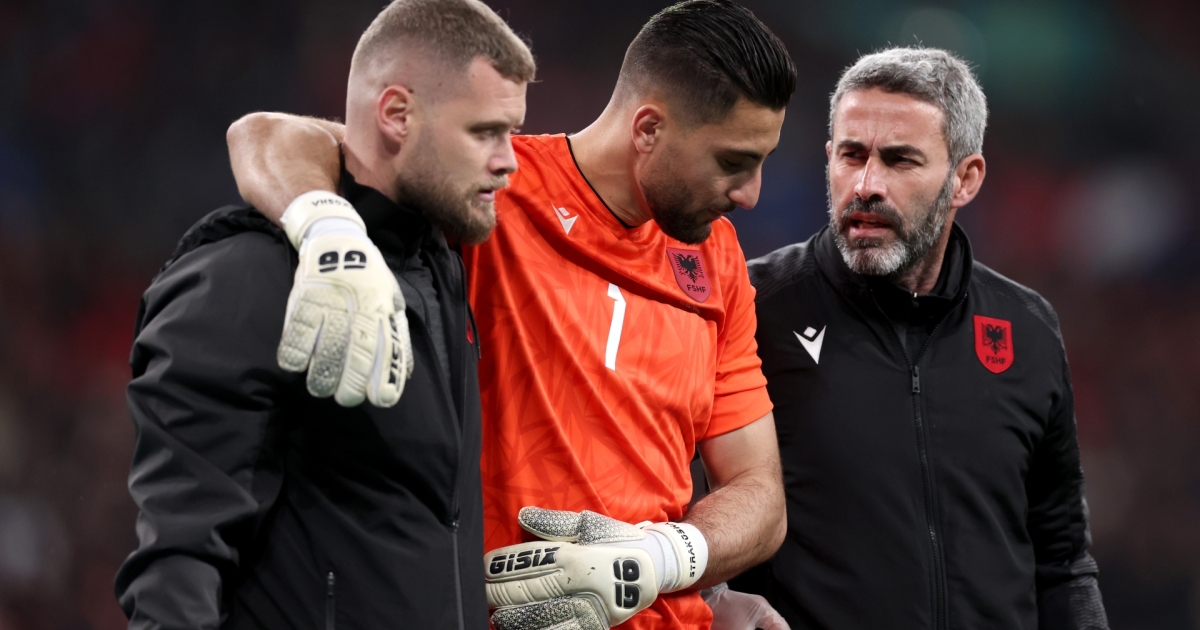 Άσχημο φινάλε επιφύλασσε η μοίρα για τον Θωμά Στρακόσα στον αγώνα του «Wembley». Αν και ο γκολκίπερ της Αλβανίας είχε μια σπουδαία βραδιά με ορισμένες καθοριστικές επεμβάσεις στις προσπάθειες των Άγγλων, τελικά ένας τραυματισμός στο κεφάλι δεν του επέτρεψε να ολοκληρώσει τον αγώνα.