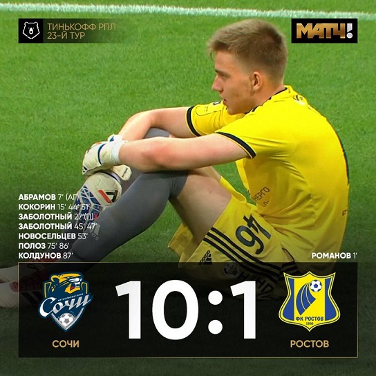 Σκορ που σημειώνεται για πρώτη φορά στην μεγάλη κατηγορία του ρωσικού ποδοσφαίρου (ο 17χρονος τερματοφύλακας Ντένις Ποπόφ απέκρουσε πέναλτι του Αντόν Ζαμπολότνι, με το σκορ στο 2-1), αλλά αναμφίβολα σπιλώνει την ιστορία της Σότσι, παρά τη νίκη της...