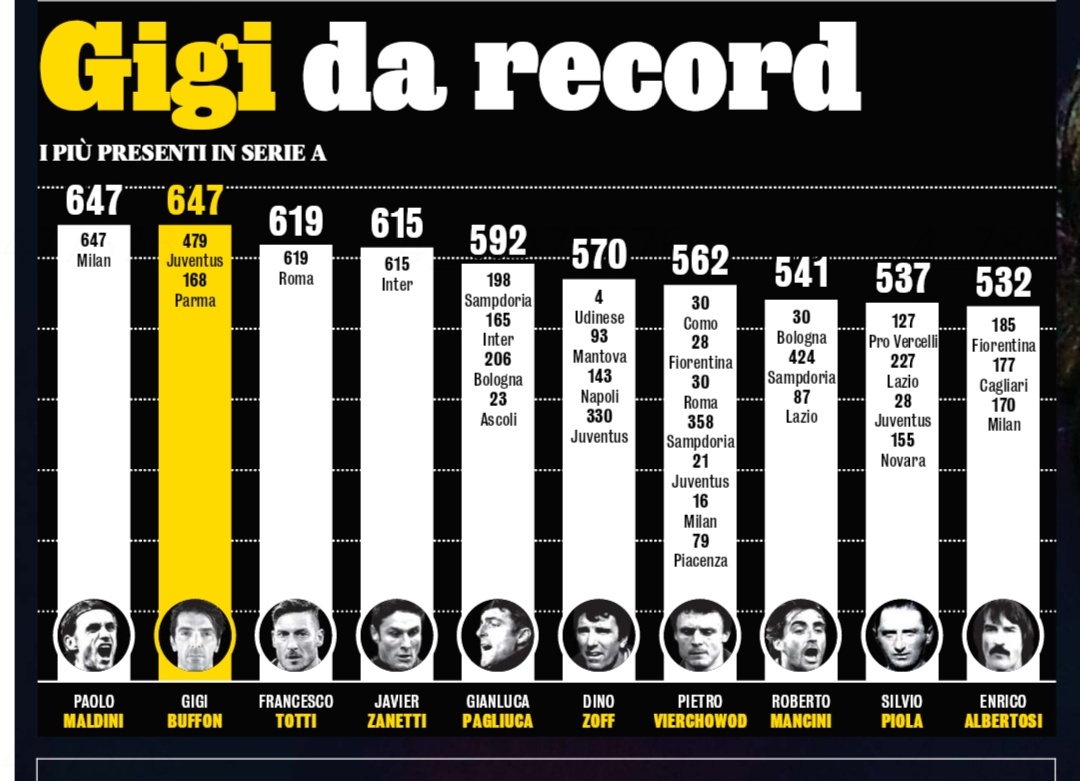 Είναι λογικό να πάρει συμμετοχές μέχρι και το επόμενο καλοκαίρι και αυτή τη στιγμή ο Μπουφόν χρειάζεται μόλις μια για να γίνει ο κορυφαίος όλων των εποχών σε επίπεδο εμφανίσεων στη Serie A.