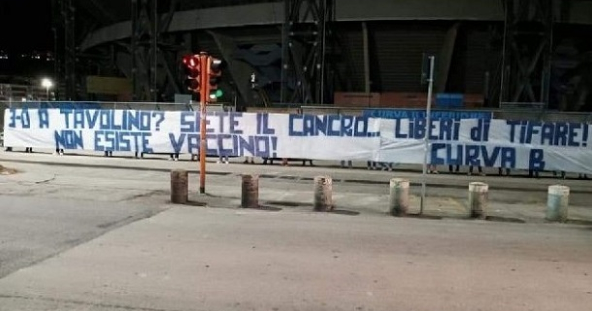 Πολύ σκληρά πανό κατά της Γιουβέντους από οπαδούς της Νάπολι έξω από το «Σαν Πάολο», μετά τη νίκη των Μπιανκονέρι στα χαρτιά με 3-0.