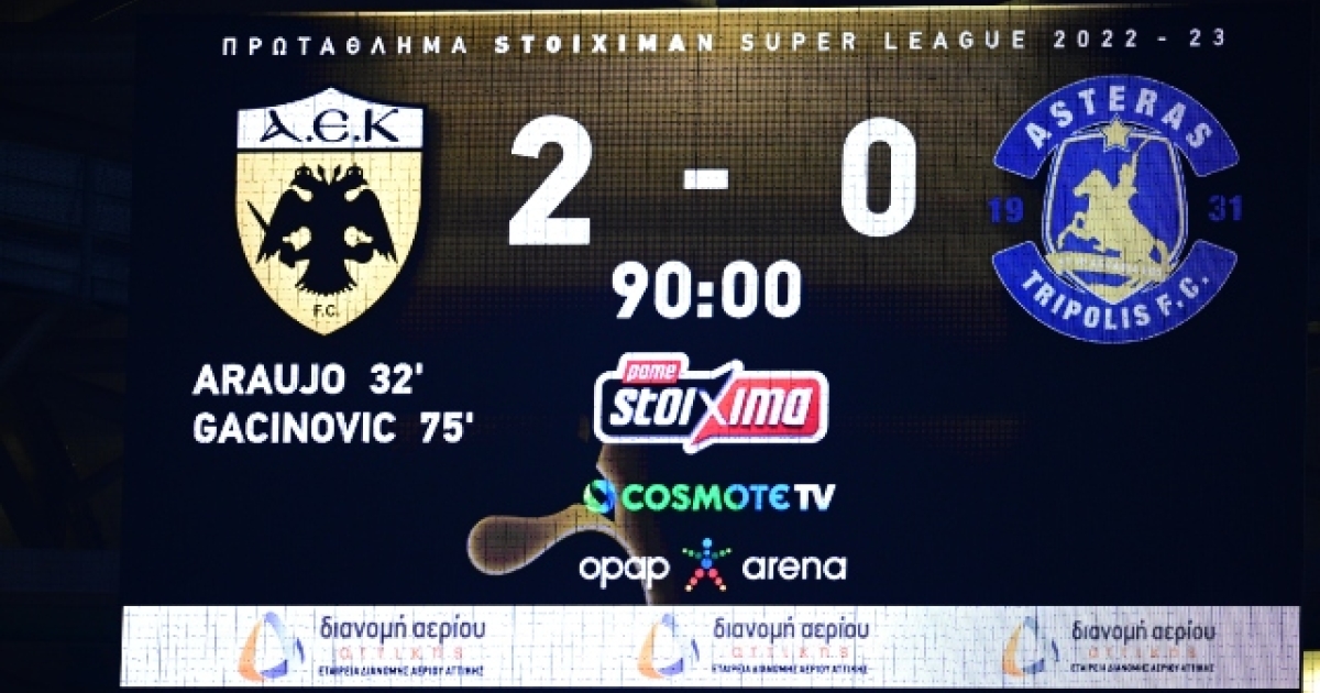 Η ΑΕΚ διατήρησε το απόλυτο στην «OPAP Arena», καθώς επικράτησε 2-0 του Αστέρα Τρίπολης χάρις στα τέρματα των Αραούχο, Γκατσίνοβιτς.