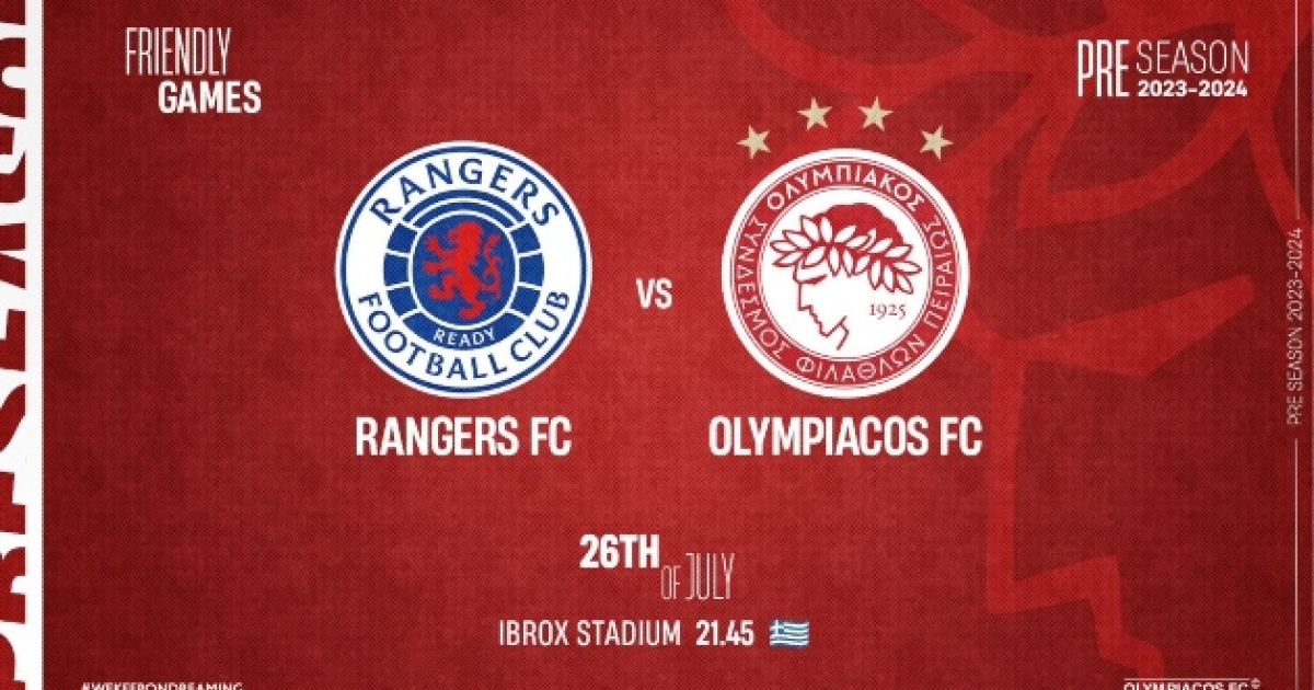 Ο Ολυμπιακός θα ταξιδέψει στη Γλασκώβη για να αντιμετωπίσει την ομάδα της Ρέιντζερς. Η αναμέτρηση θα διεξαχθεί την Τετάρτη 26 Ιουλίου στο «Ibrox Stadium», στις 21:45 (θα είναι και ο τελευταίος εντός έδρας αγώνας των Σκωτσέζων πριν από την έναρξη των επίσημων αγώνων τους), ενώ τρεις μέρες αργότερα θα αντιμετωπίσει την Νόριτς στο Carrow Road.