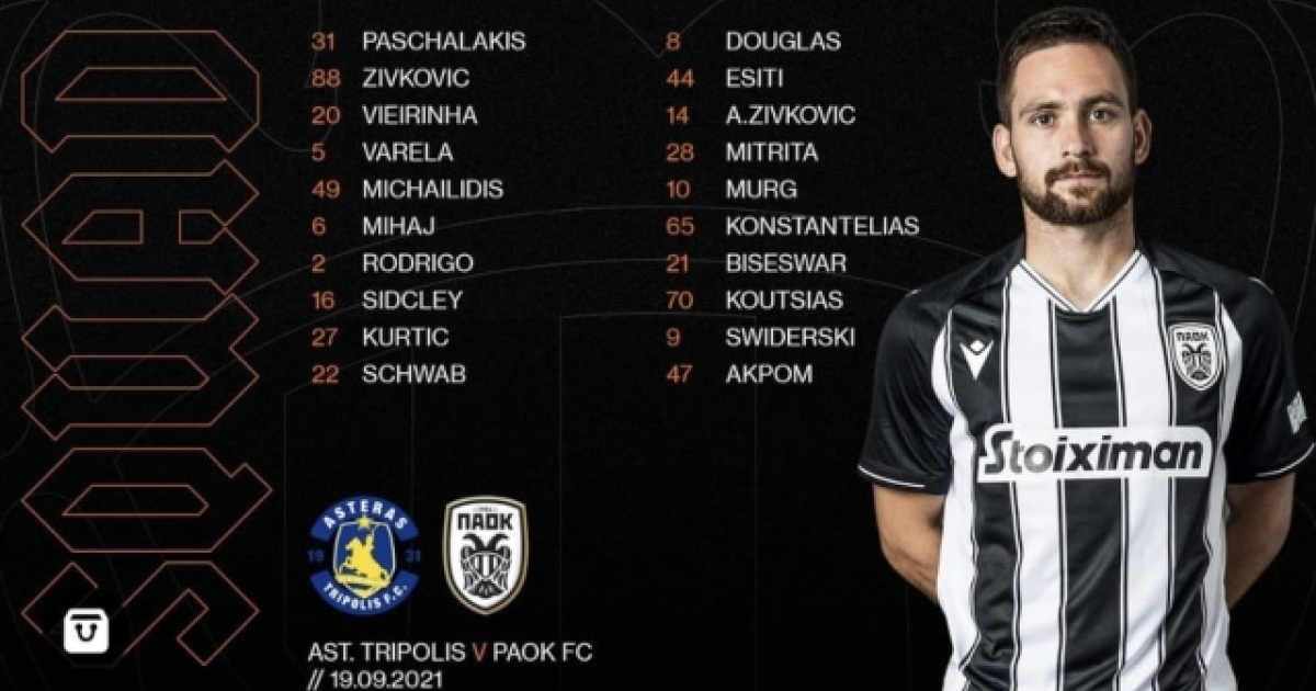 Με νέο πρόσωπο τον Αντρίγια Ζίβκοβιτς, αλλά χωρίς τους Καγκάβα, Τέιλορ και Τσιγγάρα θα αγωνιστεί ο ΠΑΟΚ στην Τρίπολη κόντρα στον Αστέρα.