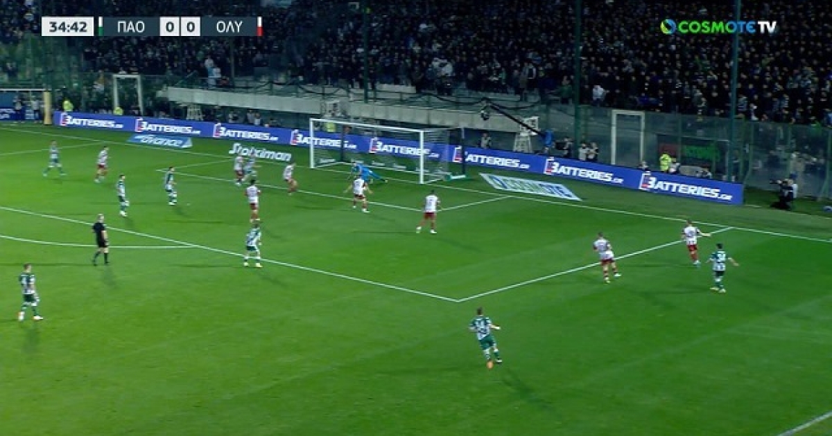 Συγκεκριμένα στο 35' ο Αργεντινός εξτρέμ βρήκε χώρο, έκανε το γύρισμα παράλληλα με την εστία του Ολυμπιακού και ο Πασχαλάκης κατάφερε να της αλλάξει έστω και λίγο πορεία για να μην υπάρξει απειλή για το τέρμα του.
