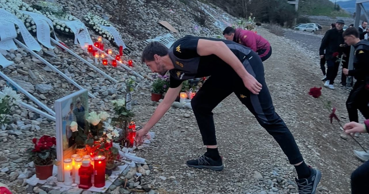 Εκεί κατέθεσε 57 τριαντάφυλλα τιμώντας έτσι τη μνήμη των συνανθρώπων μας που έφυγαν τόσο άδικα από τη ζωή σε μια συγκλονιστική στιγμή και για τους ποδοσφαιριστές της ομάδας οι οποίοι στάθηκαν μπροστά στα αναμμένα κεριά αλλά και στις φωτογραφίες των θυμάτων που τόσο άδικα έφυγαν από τη ζωή.