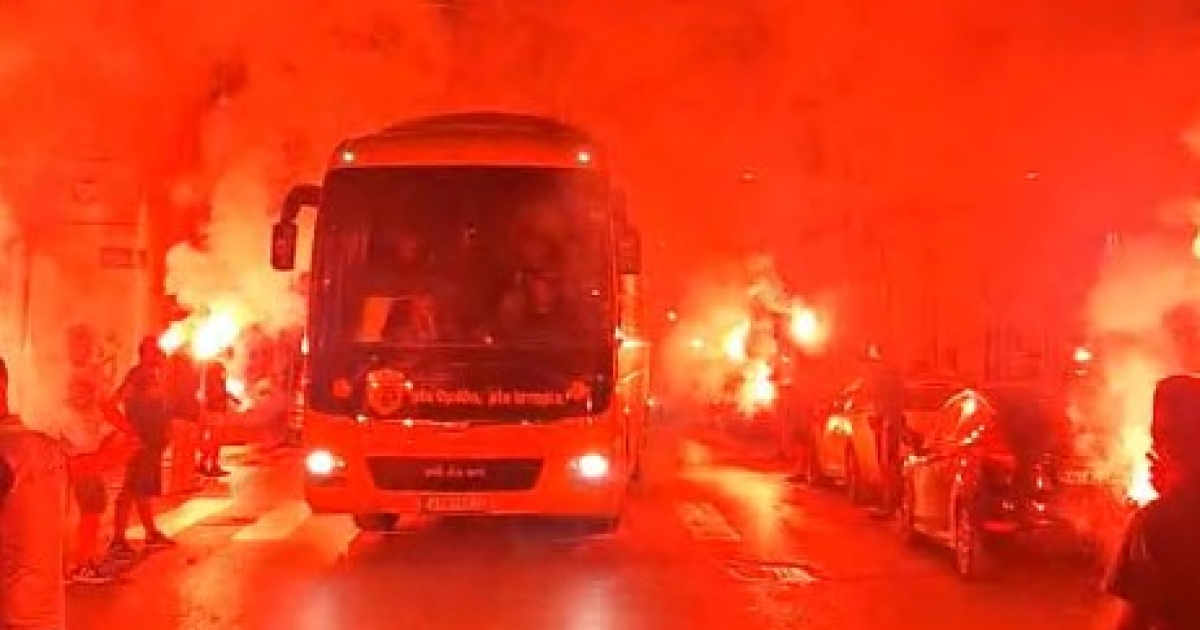 Με καπνογόνα και συνθήματα οι Ενωσίτες έκαναν... πανικό υποδεχόμενοι το πούλμαν έξω από το ξενοδοχείο στο οποίο θα καταλύσει η αποστολή.