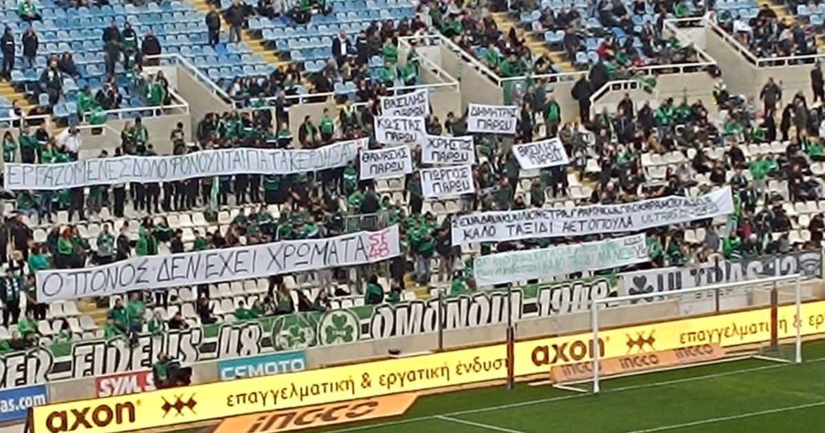 Οι Ομονοιάτες με την είσοδο των ποδοσφαιριστών στο ΓΣΠ για το ματς της ομάδας του με τον Ύψωνα, ανέβασαν στο πέταλο διάφορα πανό για τους 7 αδικοχαμένους ΠΑΟΚτσήδες, αλλά και για τις πέντε εργαζόμενες γυναίκες που έχασαν την ζωή τους, έπειτα από την έκρηξη σε εργοστάσιο «Βιολάντα».