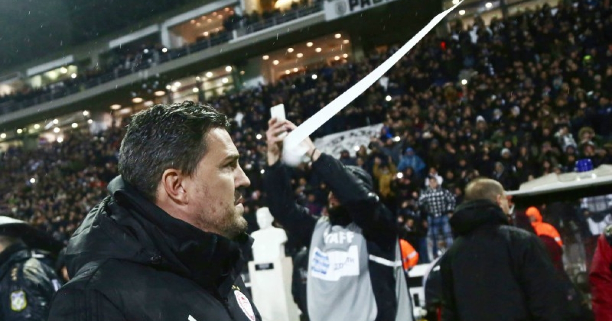 Στον... αέρα το ντέρμπι της Τούμπας πριν καν γίνει σέντρα. Ένα αντικείμενο χτύπησε τον προπονητή του Ολυμπιακού, Όσκαρ Γκαρθία, με αποτέλεσμα να χρειάζεται ιατρική βοήθεια. Επρόκειτο για ένα ρολό χαρτί που τον χτύπησε στο πρόσωπο. Στην συνέχεια και μετά από αυτήν την εξέλιξη ο Ολυμπιακός αποχώρησε για τα αποδυτήρια!