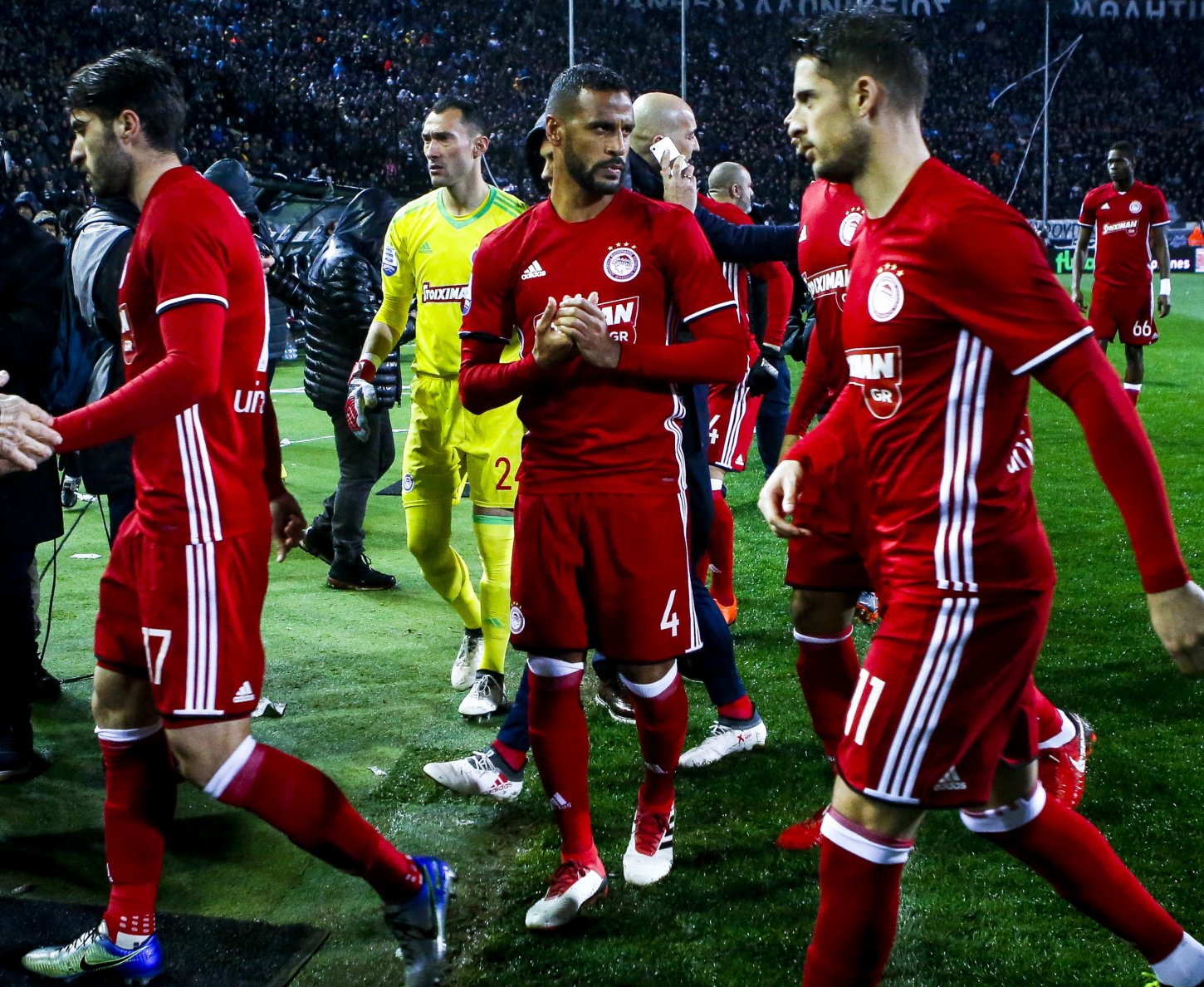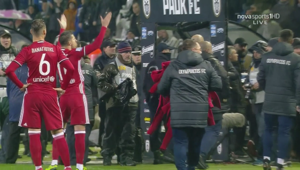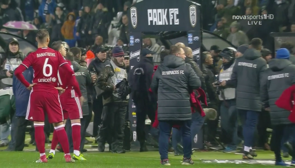 Ένα αντικείμενο έπεσε στον «ερυθρόλευκο» πάγκο και και χτύπησε τον προπονητή των Πειραιωτών, Όσκαρ Γκαρθία. Άπαντα τα μέλη της αποστολής του Ολυμπιακού κατευθύνθηκαν αμέσως στον πάγκο, πλην των παικτών, που ακολούθησαν λίγο αργότερα.