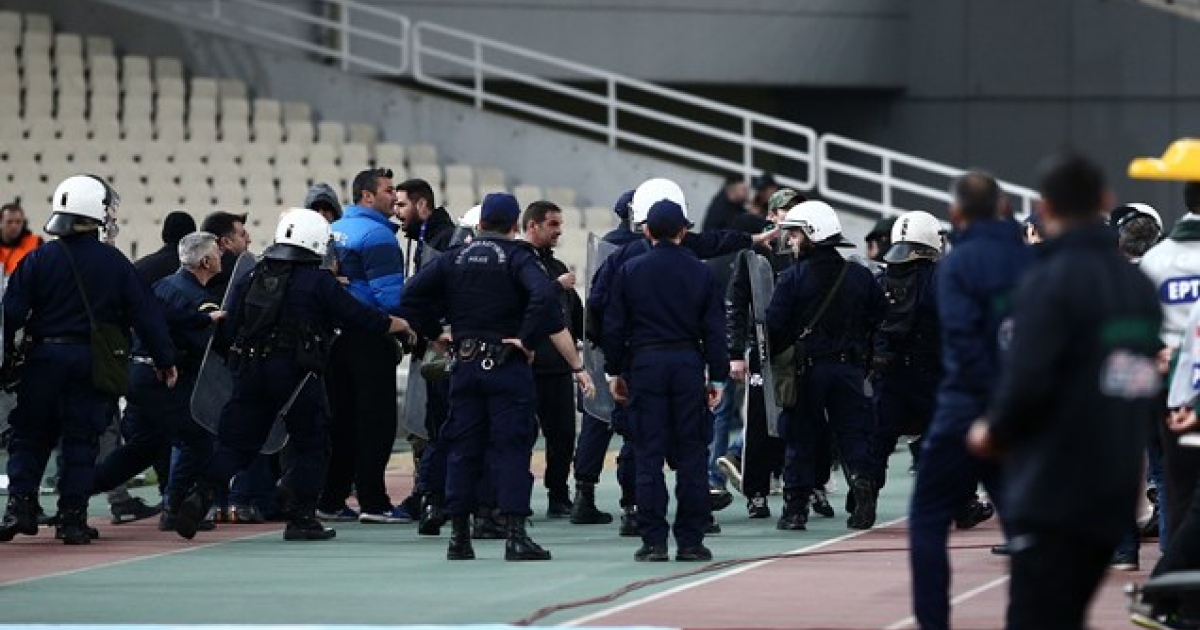 Το ντέρμπι στο ΟΑΚΑ διεκόπη λόγω εισόδου οπαδών στο ταρτάν, έχοντας στο στόχαστρο έναν από τους συνοδούς της αποστολής των Πειραιωτών. Επικράτησε ένταση και από ανθρώπους που βρίσκονταν στον πάγκο του Ολυμπιακού μεταφέρθηκε ότι ένας οπαδός κρατούσε μαχαίρι.