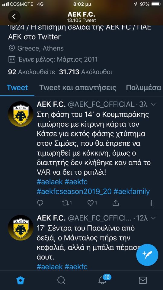Στο 14ο λεπτό ο Σιμόες έπεσε στο έδαφος έπειτα από χτύπημα του Κάτσε εκτός φάσης. Ο διαιτητής Κουμπαράκης έδειξε κίτρινη κάρτα, έπειτα από επικοινωνία και με την αίθουσα του VAR, αλλά αυτό δεν άρεσε στην ΑΕΚ, η οποία στη live περιγραφή του ματς έγραψε το παρακάτω μήνυμα...