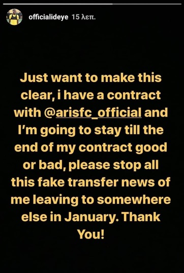 Ο Νιγηριανός φέρεται να βρίσκεται στο στόχαστρο τουρκικής ομάδας και σχεδόν σε καθημερινή βάση, υπάρχουν δημοσιεύματα περί αποχώρησής του από τον Άρη τον προσεχή Ιανουάριο. «Θέλω να ξεκαθαρίσω ότι έχω συμβόλαιο με τον Άρη και θα μείνω μέχρι το τέλος της χρονιάς καλώς ή κακώς, παρακαλώ σταματήστε όλοι με τις ψεύτικα μεταγραφικά νέα ότι θα πάω αλλού τον Ιανουάριο. Ευχαριστώ».