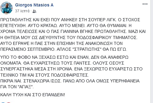 Ήταν κοινό μυστικό και απλά επέμενε κάποιος να το ανακοινώσει. Ο Γιώργος Ντάσιος με ανάρτησή του στα social media ανακοίνωσε πως αποχωρεί από την θέση του διευθυντή ποδοσφαιρικού τμήματος του ΠΑΣ Γιάννινα.