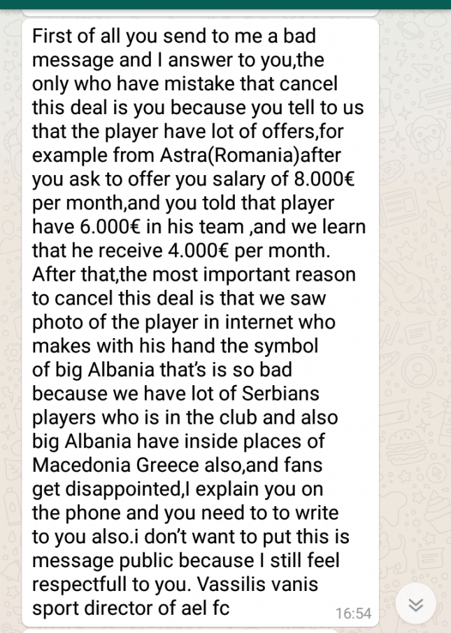 Οχι για αγωνιστικούς ή ιατρικούς λόγους, αλλά επειδή η ομάδα έκανε γνωστό πως διέρρευσαν στα social media μία φωτογραφία του ποδοσφαιριστή, όπου σχημάτιζε με τα χέρια το σύμβολο της «Μεγάλης Αλβανίας».Μάλιστα έδωσε τότε στη δημοσιότητα και το sms που έστειλε ο εκείνη την εποχή της τεχνικός της διευθυντής Βασίλης Βάνης, στον εκπρόσωπο του Μπάτχα.