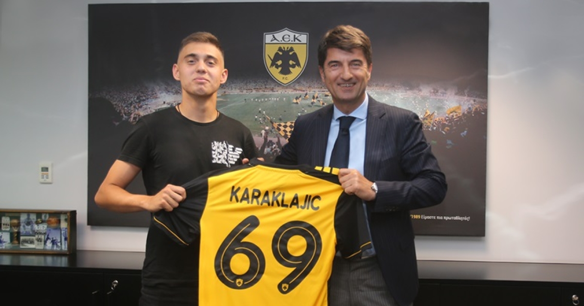«Η ΠΑΕ ΑΕΚ ανακοινώνει την απόκτηση του Πέταρ Καρακλάιτς από την FK Proleter Novisad, ομάδα της πρώτης κατηγορίας του πρωταθλήματος Σερβίας. Ο 20χρονος ποδοσφαιριστής υπέγραψε πενταετές συμβόλαιο με την ομάδα μας, μέχρι τον Ιούνιο του 2025 και πήρε τη φανέλα με το νούμερο 69, που ήταν και το πρώτο νούμερο φανέλας της μέχρι σήμερα ποδοσφαιρικής του καριέρας.