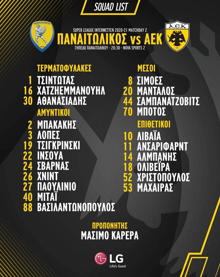 Επίσης εκτός είναι φυσικά και οι Γαλανόπουλος, Καρακλάιτς, Ενομπακάρε, Ιατρούδης και βέβαια ο Σιμάνσκι, ο οποίος δεν θα υπολογίζεται για το επόμενο διάστημα έπειτα από την επέμβαση στην οποία είχε υποβληθεί στον αχίλλειο.