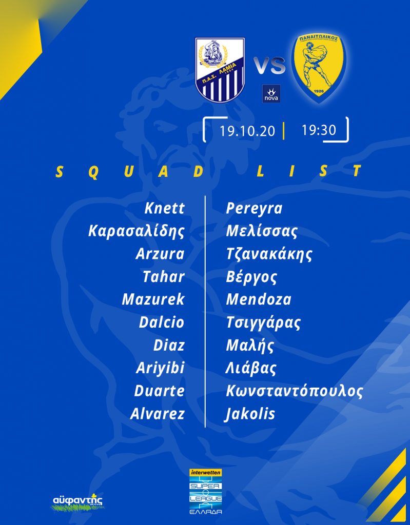 Χωρίς απρόοπτα ολοκληρώθηκε η προετοιμασία του Παναιτωλικού για το αυριανό (18/10) ματς της Λαμίας. Ο Μάκης Χάβος δεν υπολογίζει στους τραυματίες Ματσόλα, Μεντίνα και τον τιμωρημένο Βάντερσον, ενώ για πρώτη φορά στην αποστολή συμπεριλήφθηκε ο Γιάκολις. Η αποστολή των «κυανοκίτρινων» είναι η εξής: Κνετ, Καρασαλίδης, Αρσούρα, Ταχάρ, Μάζουρεκ, Ντάλσιο, Ντίας, Αριγίμπι, Ντουάρτε, Άλβαρες, Περέιρα, Μελίσσας, Τζανακάκης, Βέργος, Μεντόσα, Τσιγγάρας, Μαλής, Λιάβας, Κωνσταντόπουλος, Γιάκολις.