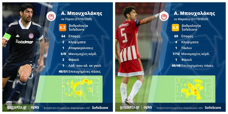 Μπορούμε στα παρακάτω γραφήματα του SofaScore να δούμε τους χώρους που καλύπτει, το πόσο περνάει η μπάλα από τα πόδια του, ο ρόλος του στην ανάπτυξη και οι μονομαχίες στις οποίες πέφτει.
