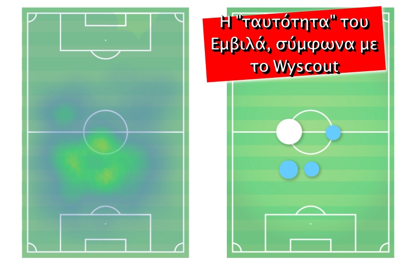 Δεν μπορεί να εκφράσει κανείς κάτι παραπάνω από μια αρχική εντύπωση για τα διαφορετικά στοιχεία που βάζει στο παιχνίδι του Ολυμπιακού ο Εμβιλά συγκριτικά με εκείνα που έδινε ο Γκιλιέρμε. Δεν είναι ίδιοι, διότι άλλωστε δεν υπάρχουν ίδιοι ποδοσφαιριστές. Ο Γάλλος είναι λιγότερο απειλητικός για την αντίπαλη εστία (σύμφωνα με το Wyscout, την κορυφαία πλατφόρμα ανάλυσης ποδοσφαίρου παγκοσμίως, από την οποία έχω αντλήσει τα στοιχεία που παραθέτω σε αυτό το κείμενο, όποτε εκτελεί (0.5 σουτ ανά ματς) ο Εμβιλά δεν έχει συντελεστή προσδοκόμενου γκολ μεγαλύτερο του “3 στα 100”). Είναι όμως το ίδιο λειτουργικός στην κυκλοφορία της μπάλας (ακρίβεια 86.4%, περίπου στα στάνταρ του Γκιλιέρμε). Κι είναι πιο αποτελεσματικός τόσο στις μονομαχίες (κερδισμένες κατά 57.3%), όσο και στον αέρα (επιτυχημένες μονομαχίες κατά 61.7%).