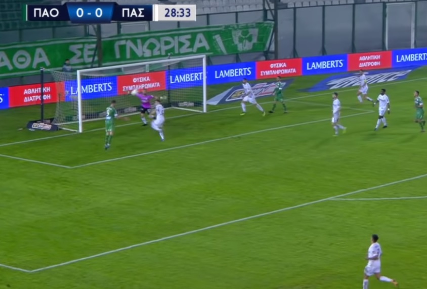 Στο κερδισμένο πέναλτι παραμένει στο δεύτερο δοκάρι, ξέρει πως έχει απελευθερωθεί από το μαρκάρισμα του Σάλιακα που έχει φύγει από κοντά του και προσπαθεί να σκοράρει με την κεφαλιά η οποία μπλοκάρει από το χέρι του αμυντικού.