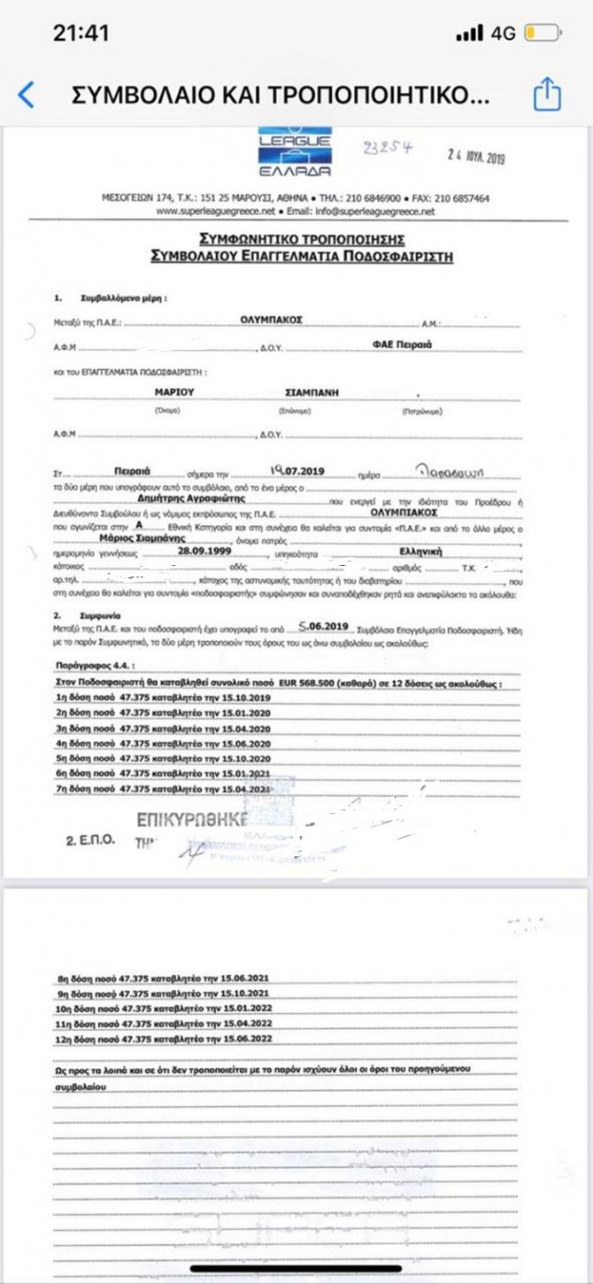 Τον Ιούλιο του 2019 η ΠΑΕ ΟΣΦΠ υπόγραψε τον Μάριο Σιαμπάνη έναντι 200.000€ το χρόνο για 3 χρόνια, δηλαδή για 600.000€ καταθέτοντας μετά το αρχικό ΚΑΙ το τροποποιητικό συμβόλαιο όπως φαίνεται στις φωτογραφίες.