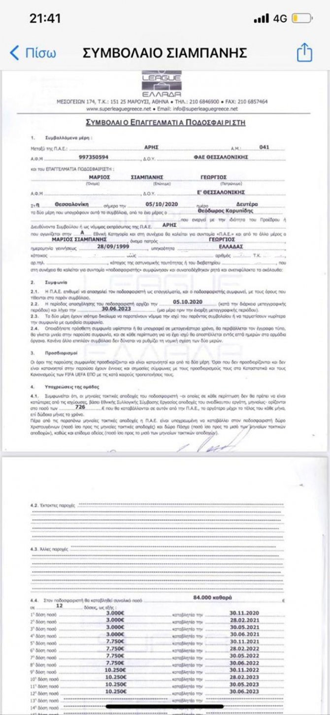 Το συμβόλαιο του Μάριου Σαμπάνη με την ΠΑΕ Άρης αγγίζει το εξωπραγματικό ποσό των 30.000€ το χρόνο όπως επίσης φαίνεται στις φωτογραφίες.