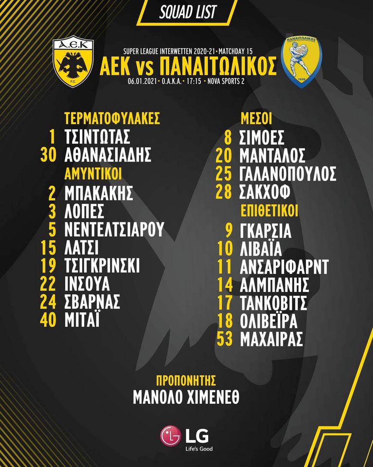 ΑΕΚ: Με Σάκχοφ και Μπακάκη οι 21 του Χιμένεθ για Παναιτωλικό, εκτός ο Κρίστιτσιτς
