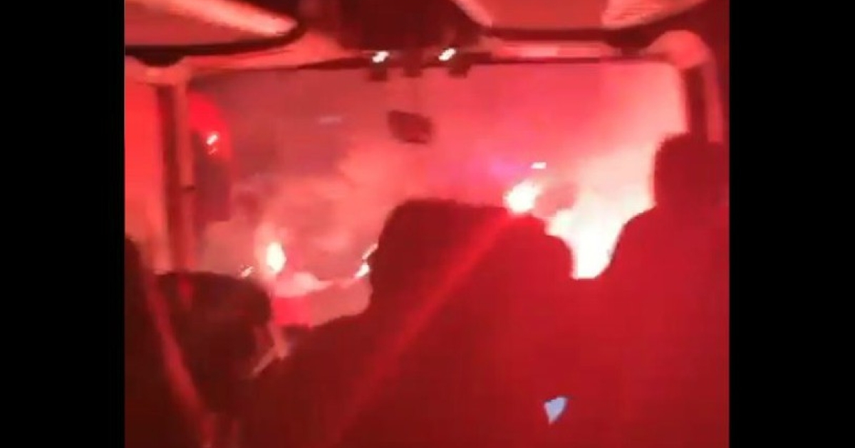 Οι φίλοι του Ολυμπιακού υποδέχθηκαν την ομάδα με καπνογόνα και συνθήματα, όπως φαίνεται και στο βίντεο που ανέβασε στο twitter ο Ματιέ Βαλμπουενά μέσα από το λεωφορείο.