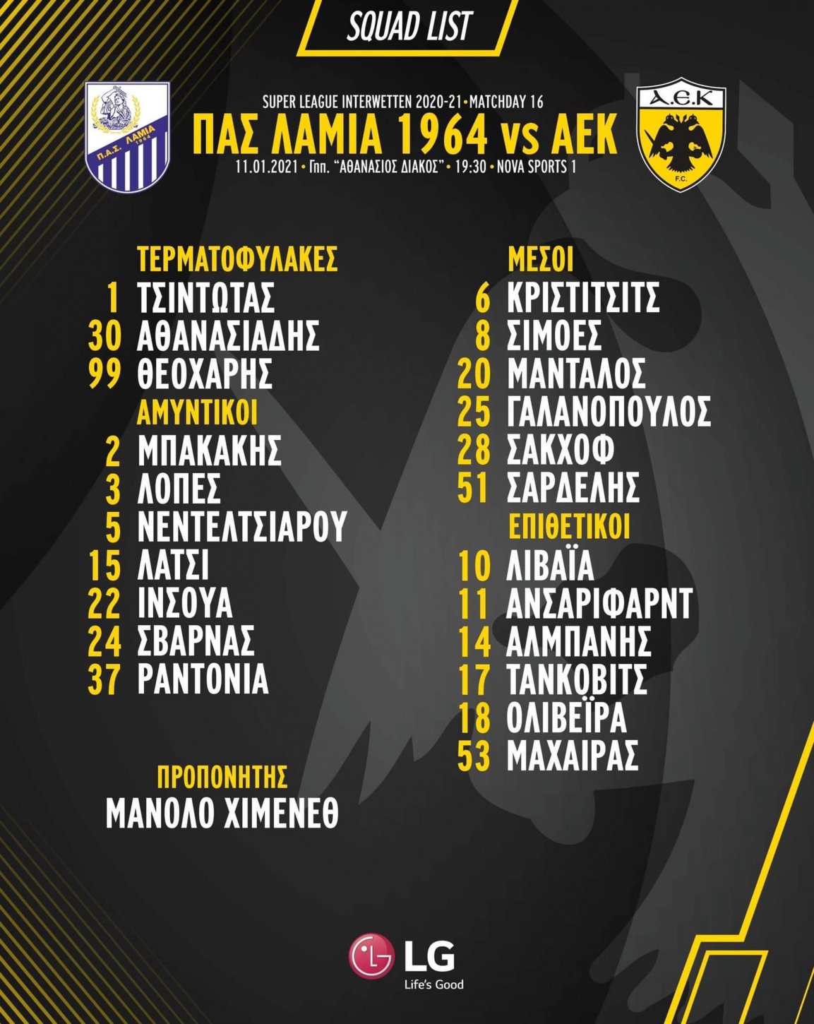 Στην αποστολή της ΑΕΚ βρίσκονται οι Τσιντώτας, Αθανασιάδης, Θεοχάρης, Μπακάκης, Λόπες, Νεντελτσιάρου, Λάτσι, Ινσούα, Σβάρνας, Ραντόνια, Κρίστιτσιτς, Σιμόες, Μάνταλος, Γαλανόπουλος, Σάκχοφ, Σαρδέλης, Μαχαίρας, Λιβάια, Ανσαριφάρντ, Αλμπάνης, Τάνκοβιτς, Ολιβέιρα.
