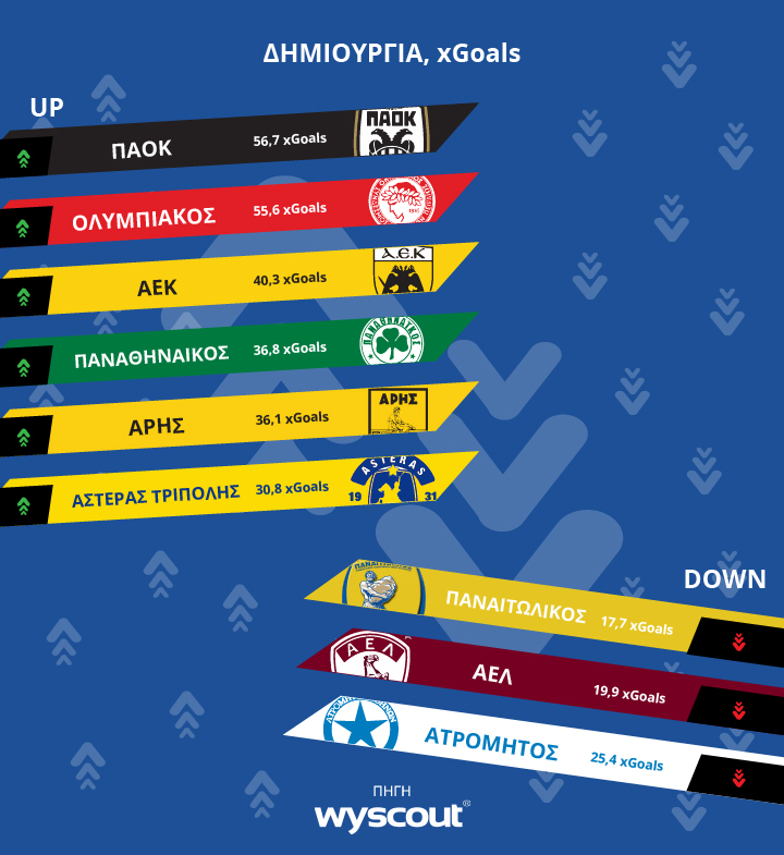 Για να μπορέσουμε να διαπιστώσουμε το πόσο ποιοτικές είναι οι ευκαιρίες που δημιουργεί μία ομάδα, θα πρέπει να εξετάσουμε τον δείκτη xGoals. Με απόλυτη ασφάλεια ο αριθμός που προκύπτει μας δίνει το πόσο καλό ή κακό είναι ένα σύνολο στην παραγωγή αξιόλογων φάσεων μπροστά στην αντίπαλη εστία. Μετά την ολοκλήρωση της κανονικής διάρκειας του πρωταθλήματος, οι αριθμοί μας δείχνουν αυτό που κατά γενική ομολογία παρατηρούμε και πάνω στο χορτάρι.