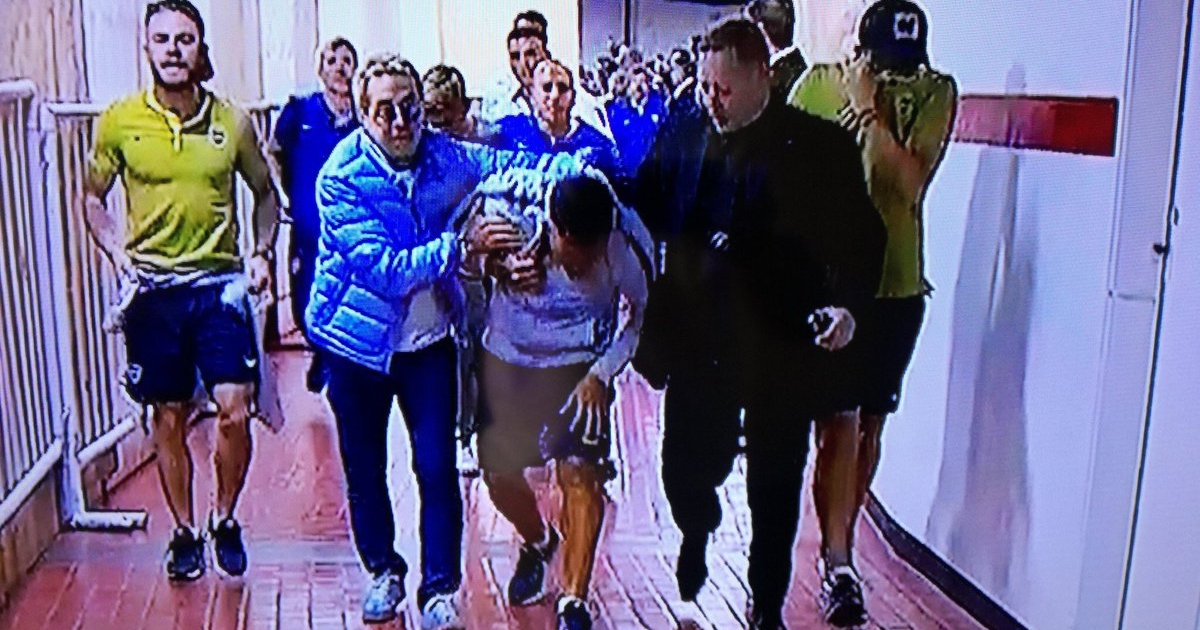 Δείτε τις εικόνες με τους φιλοξενούμενους να φτάνουν στ' αποδυτήρια του «Μονουμεντάλ» καλύπτοντας τα πρόσωπά τους με τις μπλούζες τους...