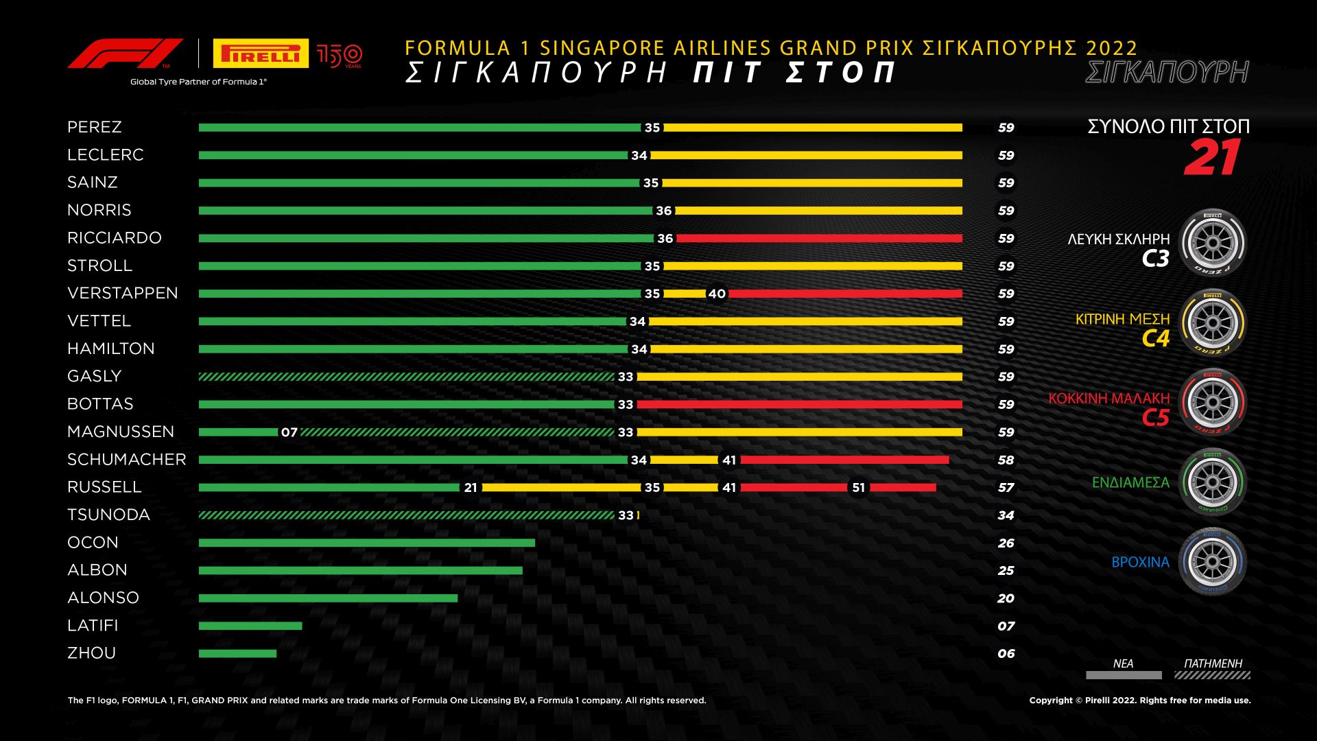 Ο αγωνιστικός διευθυντής της Pirelli, Μάριο Ίζολα, είπε σχετικά: «Τα Cinturato ενδιάμεσα ελαστικά έδειξαν πόσο αξιόπιστα είναι στον αγώνα. Παρότι ο ρυθμός φθοράς ήταν υψηλός, η απόδοσή τους ήταν εξαιρετική για μεγάλο αριθμό γύρων, όπως ακριβώς το περιμέναμε. Αυτό οφείλεται στα δεδομένα που συγκεντρώσαμε στις κατατακτήριες δοκιμές. Όπως είδαμε και το Σάββατο χρειάστηκε αρκετή ώρα για να στεγνώσει η διαδρομή καθώς λίμναζε νερό στην επιφάνεια του οδοστρώματος. Από τη στιγμή που άρχισε να στεγνώνει, η πίστα άλλαξε μορφή με τους οδηγούς να επιλέγουν τα σλικ ελαστικά. Η πλειοψηφία των ομάδων επέλεξε την P Zero κίτρινη/μέση γόμα η οποία προσέφερε βέλτιστη ισορροπία ανάμεσα στην απόδοση, στην εύκολη προσέγγιση σε θερμοκρασία λειτουργίας και στην διάρκεια. Οι οδηγοί έπρεπε να δείχνουν ιδιαίτερη προσοχή για να μην πατήσουν εκτός γραμμής και να αποφύγουν την απώλεια θερμότητας από τα νερά που έψυχαν τα ελαστικά και τα έβγαζαν από το παράθυρο θερμοκρασιακής λειτουργίας. Η επιστροφή στη Σιγκαπούρη μπροστά σε τόσους χιλιάδες θεατές έδειξε τι πραγματικά είναι η Formula 1, ήταν ένα θεαματικό Σαββατοκύριακο».