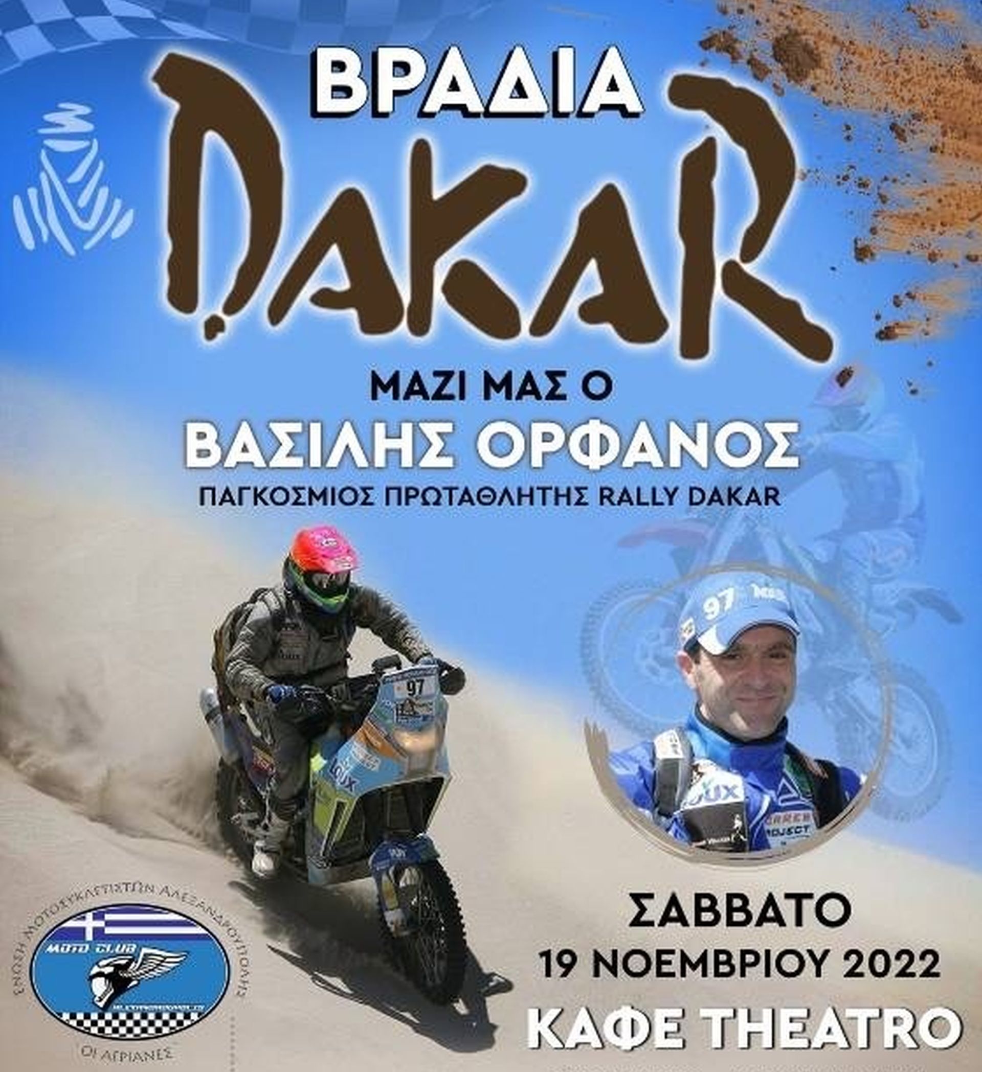 Μπορεί το Ράλλυ Ντακάρ 2023 να είναι ακόμα τρεις εβδομάδες μακριά, ωστόσο στην Αλεξανδρούπολη φιλοξενήθηκε μία βραδιά γεμάτη… άμμο! Η VOM και ο Βασίλης Ορφανός ταξίδεψαν στην ακριτική πόλη, ύστερα από πρόσκληση της Ένωσης Μοτοσικλετιστών Αλεξανδρούπολης «ΑΓΡΙΑΝΕΣ», του προέδρου της Ηλία Γρηγοράκη και των μελών της.