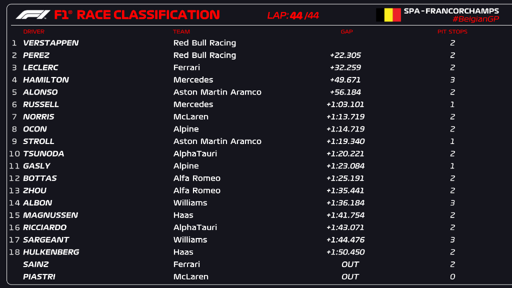 A perfect Spa day for the Dutchman who finishes ahead of team mate Sergio Perez. Charles Leclerc takes the final podium place 👍#BelgianGP #F1 pic.twitter.com/5jJI01BE07