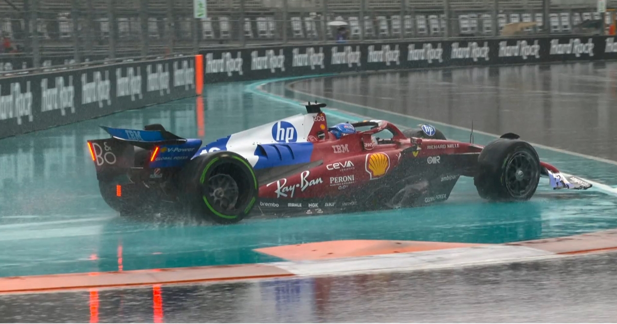 With rain falling heavily, Leclerc sustains heavy damage on his way to the grid after contact with the wall#F1 #F1Sprint #MiamiGP pic.twitter.com/XGiaxPPuBq