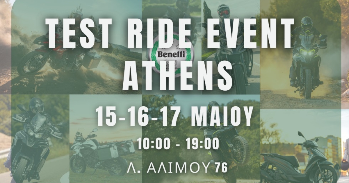 Η Motoway προσκαλεί όλους τους φίλους της μοτοσικλέτας σε ένα μοναδικό Test Ride Event, που θα πραγματοποιηθεί στο κατάστημα Benelli στην Αθήνα, Λ.Αλίμου 76, Αργυρούπολη, στις 15, 16 και 17 Μαΐου 2025
