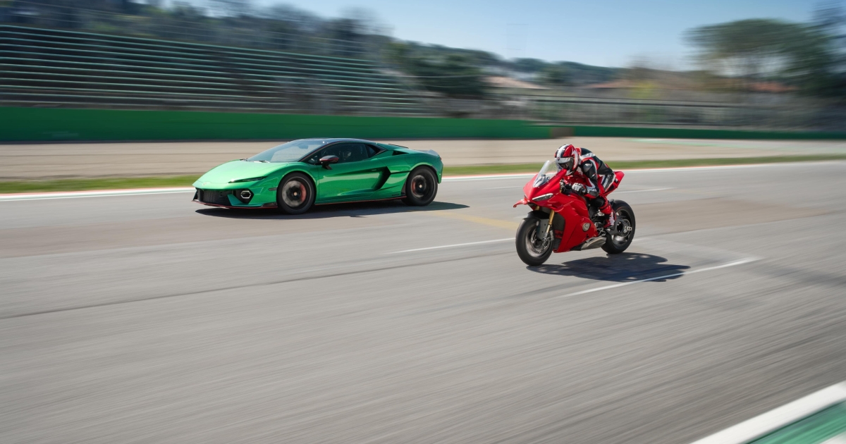Δεν είναι η πρώτη φορά που δύο ιταλικές υπερδυνάμεις συγκρούονται. Αλλά σπάνια το κάνουν με τέτοιο τρόπο: πρόσωπο με πρόσωπο, στα λίγα μέτρα που μετράνε. Από τη μία, η ολοκαίνουργια Lamborghini Temerario, ένα υβριδικό τέρας 920 ίππων με V8 biturbo που ουρλιάζει στις 10.000 στροφές. Από την άλλη, η Ducati Panigale V4, η κορωνίδα της Μπολόνια, με μοτοσικλετιστική φινέτσα MotoGP και 216 άλογα να χτυπούν τον κόφτη.
