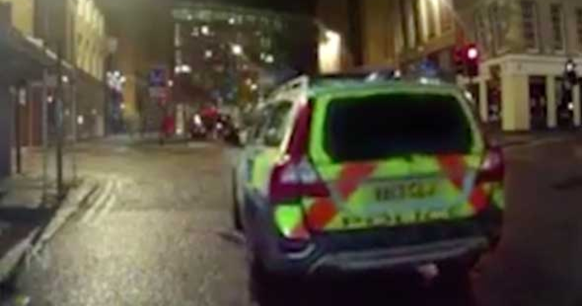 Στο κέντρο της πόλης Νιούκαστλ στην Αγγλία, η κάμερα ενός σταθμευμένου αυτοκινήτου που εκείνη την ώρα ήταν μάλιστα μέσα και ο οδηγός του, κατέγραψε τη σκηνή ενός περιπολικού που κύλησε πίσω χωρίς χειρόφρενο.