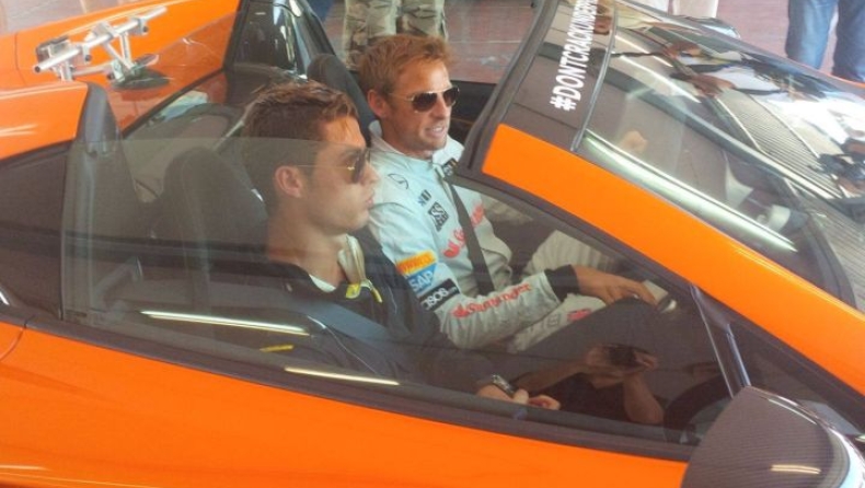Ο Jenson Button να οδηγεί την McLaren 650S Spider και ο Cristiano Ronaldo με το χρυσό του πόδι να προσπαθεί να βάλει την μπάλα στο εσωτερικό του ανοιχτού αυτοκινήτου, ενώ ο οδηγός της Formula1 κάνει ντόνατς.
