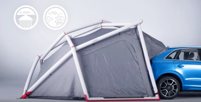 Μέσα σε λίγα λεπτά, το Audi Q3 μπορεί να... μεταμορφωθεί σε σκηνή, χάρη σε μία ειδική προέκταση, η οποία προσφέρεται από την ίδια την εταιρεία προαιρετικά! Με απλές κινήσεις και μια τρόμπα, έχετε το... απόλυτο εργαλείο για κάμπινγκ! Το ύφασμα είναι ανθεκτικό στις κακές καιρικές συνθήκες, ενώ έχει σεβαστές διαστάσεις που μπορούν να κοιμίσουν έως και τρία άτομα! Όταν αναδιπλωθεί, το μέγεθός της δεν ξεπερνά αυτό μιας βαλίτσας.