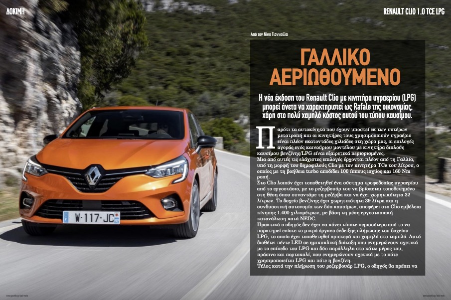 Παρότι τα αυτοκίνητα που έχουν υποστεί εκ των υστέρων μετατροπή και οι κινητήρες τους χρησιμοποιούν υγραέριο είναι πλέον εκατοντάδες χιλιάδες στη χώρα μας, οι επιλογές αγοράς ενός καινούριου μοντέλου με κινητήρα διπλούς καυσίμου βενζίνης/LPG είναι εξαιρετικά περιορισμένες. Μια από αυτές τις ελάχιστες επιλογές έρχονται πλέον από τη Γαλλία, υπό τη μορφή του δημοφιλούς Clio με τον κινητήρα TCe του λίτρου, ο οποίος με τη βοήθεια turbo αποδίδει 100 ίππους ισχύος και 160 Nm ροπή. Στο Clio λοιπόν έχει τοποθετηθεί ένα σύστημα τροφοδοσίας υγραερίου από το εργοστάσιο, με το ρεζερβουάρ του να βρίσκεται τοποθετημένο στη θέση όπου συναντάμε τη ρεζέρβα και να έχει χωρητικότητα 32 λίτρων. Το δοχείο βενζίνης έχει χωρητικότητα 39 λίτρα και η συνδυαστική αυτονομία των δύο καυσίμων, αποφέρει στο Clio εμβέλεια κίνησης 1.400 χιλιομέτρων, με βάση...