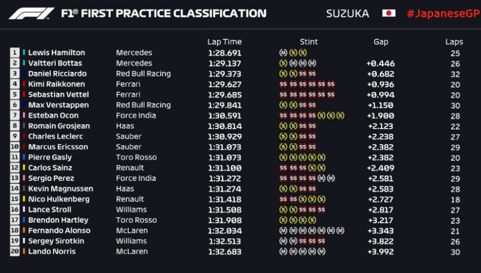 Τα δεύτερα ελεύθερα δοκιμαστικά στην Ιαπωνία, έφεραν εκ νέου τον Λιούις Χάμιλτον στην κορυφή, μπροστά από τον ομόσταυλο του, Βάλτερι Μπότας. Πρόκειται για το δεύτερο 1-2 της Mercedes, μετά από αυτό του FP1 νωρίς σήμερα το πρωί, δείχνοντας με το καλημέρα τις διαθέσεις της γερμανικής ομάδας και κυρίως του Βρετανού πιλότου και Παγκόσμιου Πρωταθλητή.