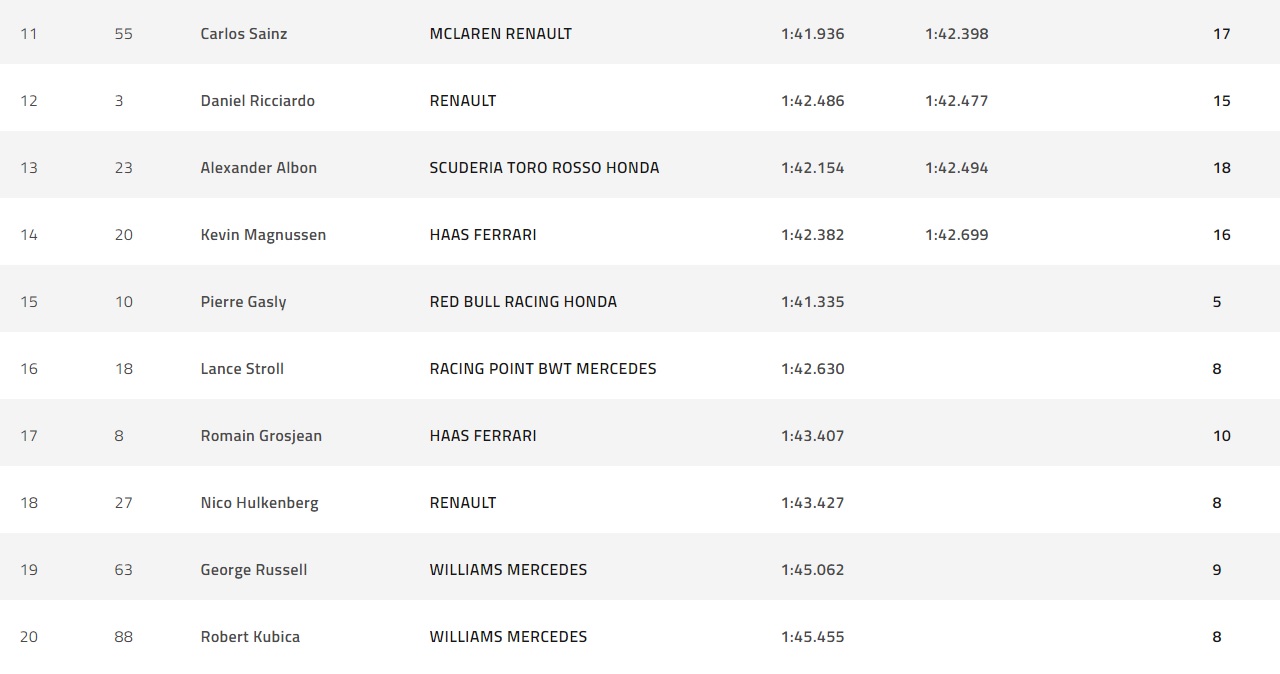 Κατά τα λοιπά οι δύο Mercedes έδειχναν συνεχώς ταχύτερες από τον ανταγωνισμό. Ο Χάμιλτον έκανε έναν γρήγορο χρόνο στο Q3 και ανέβηκε πρώτος, ο Φέτελ προσπάθησε να τον πιάσει, όμως τελικά δεν ξεπέρασε το χρόνο του και ο Βρετανός παρέμεινε πρώτος. Αυτό, για λίγα μόνο δευτερόλεπτα γιατί ήρθε ο Μπότας και του πήρε την pole position. Σε κάθε περίπτωση το 1-2 είναι ένα φοβερό αποτέλεσμα για τη Mercedes. Ο Φέτελ τρίτος, Φερστάπεν και Πέρεθ ολοκληρώνουν την πεντάδα. Δείτε αναλυτικά τα αποτελέσματα των κατατακτηρίων δοκιμών ακριβώς από κάτω.