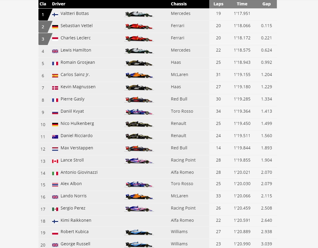 Τα πρώτα ελεύθερα δοκιμαστικά για το ισπανικό Γκραν Πρι, έφεραν τον Βάλτερι Μπότας στην πρώτη θέση, αφήνοντας πίσω του τις 2 Ferrari των Σεμπάστιαν Φέτελ και Σαρλ Λεκλέρκ στην δεύτερη και τρίτη θέση αντίστοιχα. Τέταρτος ήταν ο Λιούις Χάμιλτον, ενώ την πρώτη πεντάδα συμπλήρωσε ο Ρομέν Γκροζάν με Haas.