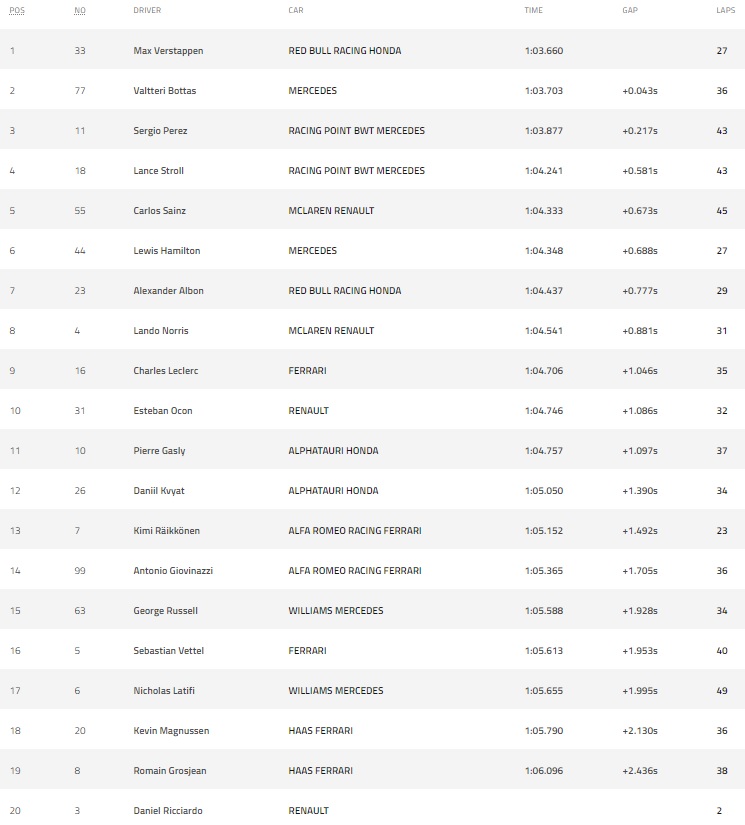 Αρκετά πιο γρήγορος σε σχέση με τα πρώτα ελεύθερα δοκιμαστικά ήταν ο Μαξ Φερστάπεν, ο οποίος κατάφερε από τη δεύτερη θέση, να ανέβει στην πρώτη. Ο Ολλανδός επικράτησε του Βαλτέρι Μπότας, που είναι ο δεύτερος ταχύτερος και ο Σέρχιο Πέρεθ που στο FP1 ήταν ο πρώτος, πλέον είναι τρίτος. Η καλή εμφάνιση της Racing Point πιστοποιείται από την τέταρτη θέση του Λανς Στρολ, ο οποίος ωστόσο ήταν περίπου 4 δέκατα πιο αργός από τον teammate του.
