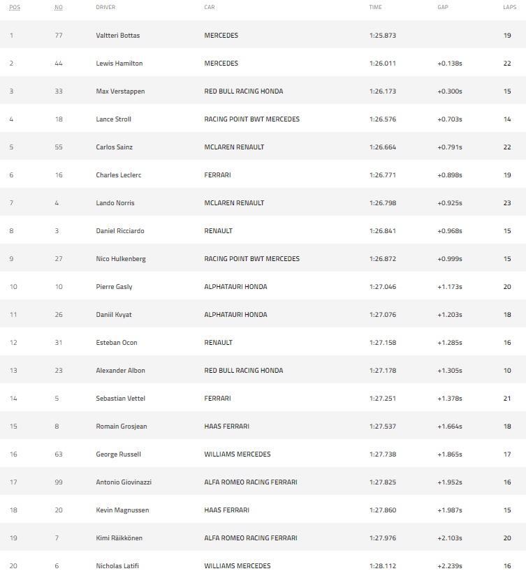 Βαλτέρι Μπότας να θέτει τον κορυφαίο χρόνο και τον Λιούις Χάμιλτον να τον ακολουθεί. Ο Μαξ Φερστάπεν επίσης, κατάφερε να μπει στην τριάδα, ενώ ο Λανς Στρολ και ο Κάρλος Σάινθ, στην πεντάδα. Λεκλέρ, Νόρις, Ρικιάρντο έχουν την έκτη, έβδομη και όγδοη θέση αντίστοιχα, ενώ ο Νίκο Χούλκενμπεργκ που τρέχει εκτάκτως με την Racing Point, είχε έναν πολύ καλό ρυθμό και έκλεισε στην ένατη θέση.