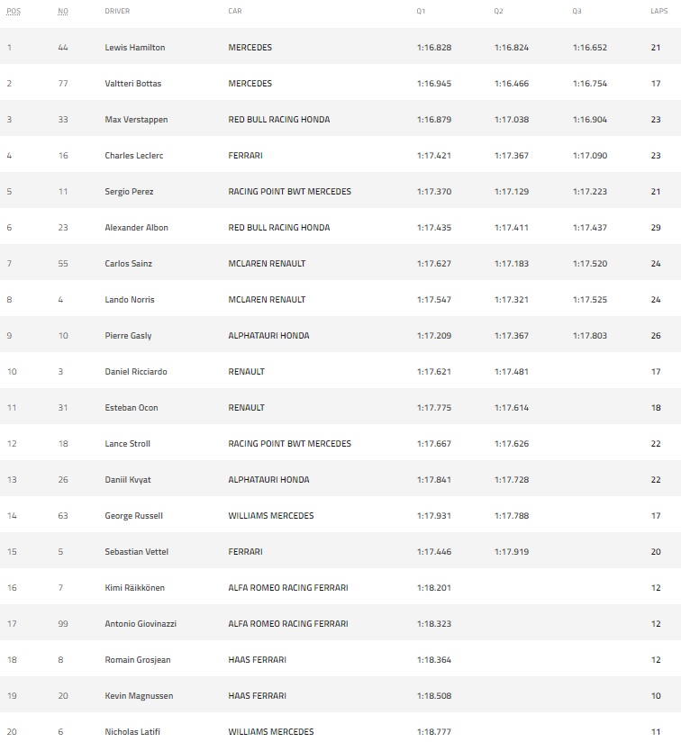 Οπότε δεν χρειάστηκε παρά μόνο μερικά δευτερόλεπτα για να πάρει πίσω την pole position. Έτσι λοιπόν για ακόμη μια φορά διαμορφώθηκε το 1-2 για τη Mercedes και στην τρίτη θέση ακολουθεί ο πολύ γρήγορος κατά τα λοιπά Μαξ Φερστάπεν. Το Σάββατο ήταν καλό και για τη Ferrari. Τα καλά αποτελέσματα δεν θεωρούνται πλέον... δεδομένα στη Scuderia και η τέταρτη θέση του Σαρλ Λεκλέρ ήταν ένα θετικό νέο. Πέρεζ, Άλμπον βρίσκονται πίσω από τον Μονεγάσκο, ενώ Σάινθ, Νόρις, Γκασλί και Ρικιάρντο κλείνουν την κατάταξη του Q3. Να μη ξεχάσουμε να αναφέρουμε ότι η διαδικασία των κατατακτήριων καθυστέρησε κατά μισή ώρα λόγω ενός σπασμένου καλύμματος για τον «νεροχύτη» της πίστας στη στροφή 14. Δείτε παρακάτω αναλυτικά τα αποτελέσματα, τη σειρά εκκίνησης για τον αγώνα της Κυριακής στο Πορτιμάο και τους χρόνους που πέτυχε ο κάθε πιλότος.