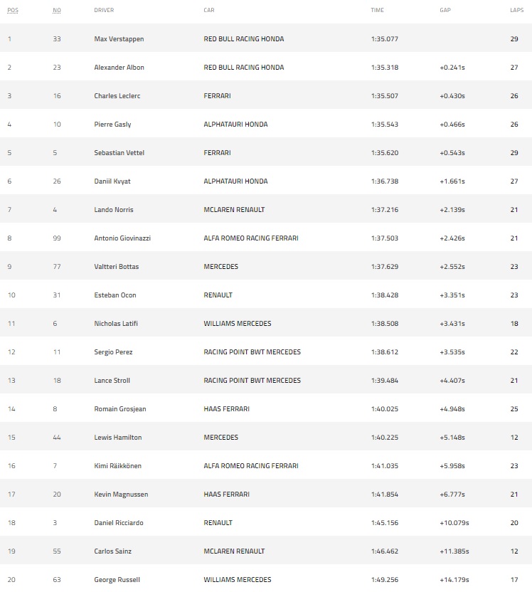 Ο Πιέρ Γκασλί ακολουθεί ακριβώς από πίσω και ο Σεμπάστιαν Φέτελ μπαίνει στην πεντάδα, που επίσης είναι ένα αξιοσημείωτο γεγονός, από μόνο του. Κβίατ, Νόρις, Τζιοβινάτσι, Μπότας και Οκόν συμπλήρωσαν τη δεκάδα και ο Λιούις Χάμιλτον βρέθηκε στη 15η θέση. Κακή ήταν η μέρα για τον Κάρλος Σάινθ ο οποίος αντιμετώπισε ένα μηχανικό πρόβλημα. Γενικά πάντως οι οδηγοί δεν μπορούσαν να βρουν πρόσφυση λόγω της υγρασίας στην άσφαλτο και μάλιστα, ο Λάντο Νόρις είπε ότι γλιστράει πιο πολύ και από τον... πάγο. Παρακάτω ακολουθούν αναλυτικά τα αποτελέσματα και οι χρόνοι από την πρώτη περίοδο των ελεύθερων δοκιμαστικών της Formula 1 στην Τουρκία.