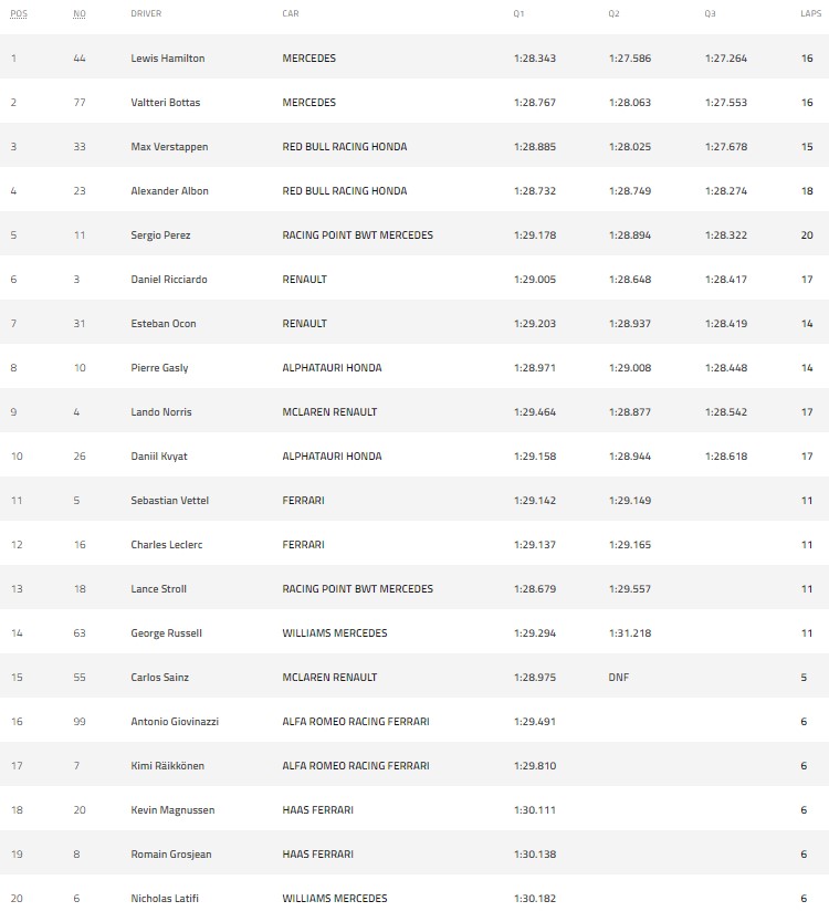 Ο Βαλτέρι Μπότας όπως πάντα έδωσε μια τίμια προσπάθεια και χάρισε ακόμη ένα 1-2 στη Mercedes με τη δεύτερη θέση που κέρδισε, ενώ ο Μαξ Φερστάπεν ενώ ήταν δυνατός παντού, έμεινε τρίτος. Τέταρτος βρίσκεται ο teammate του, Άλεξ Άλμπον, που στη δεύτερη περίοδο των ελεύθερων δοκιμαστικών είχε τη σφοδρή έξοδο από την πίστα και κατέστρεψε μεγάλο μέρος του μονοθεσίου του στις μπαριέρες. Πέρεθ, Ρικιάρντο, Οκόν, Γκασλί, Νόρις, Κβίατ είναι η συνέχεια της κατάταξης μέσα στη δεκάδα. Οι δύο Ferrari για ακόμη μια φορά δεν κατάφεραν να μπουν στο Q3, ο Φέτελ ωστόσο έδειξε αρκετά πιο δυνατός από άλλες φορές και αυτό ίσως μεταφραστεί σε έναν καλό αγώνα για τον Γερμανό αύριο.